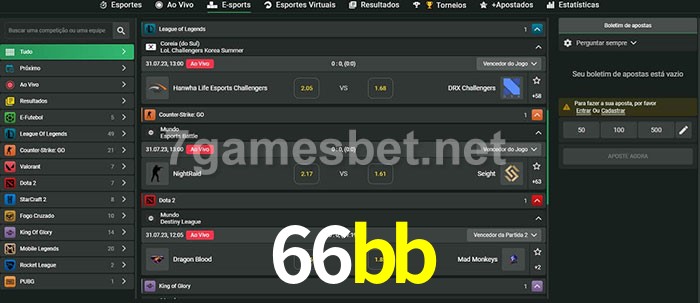 O 66bb oferece uma grande seleção de opções de apostas em e-sports com probabilidades competitivas
